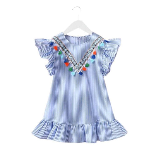 Tassel Flying Sleeves Dress, Blue, Cotton