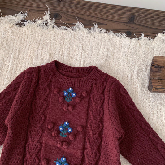 Hand-Embroidered Deep Red Woolen Sweater,6M to 4T.