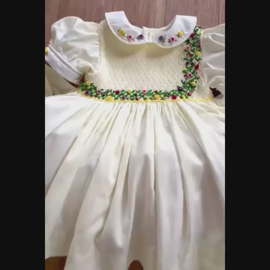 Stunning Full Hand Smocked Dress, White-Blue,Yellow-Pink,6M to 8T