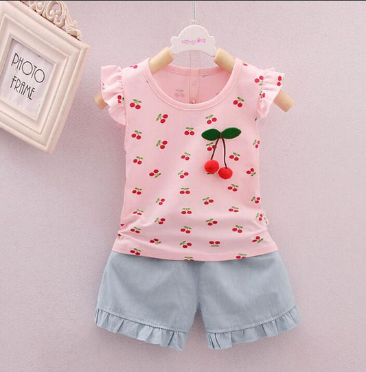Cute Cherry Print Summer Top with Shorts,Pink/Yellow,1Y-4Y.