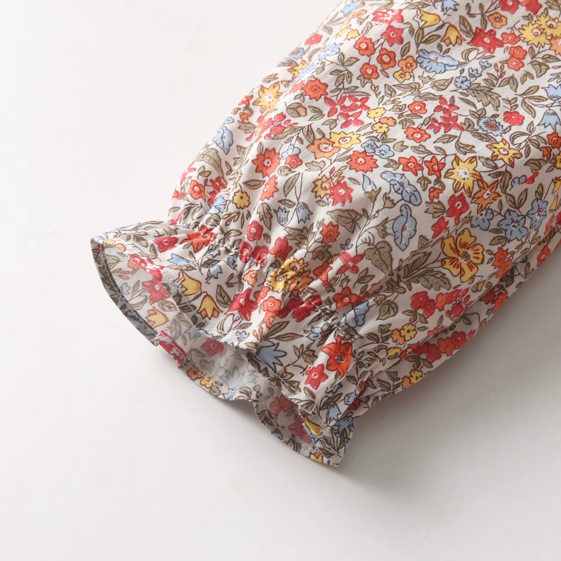 This lovely piece is made from 100% soft, breathable cotton and features a delicate floral print in hues of dusty rose, ochre, and sky blue — a palette that feels straight out of an English countryside garden. The ruffled Peter Pan collar, finished with contrasting navy embroidery and velvet ribbon, adds a touch of old-world elegance to this modern heirloom.