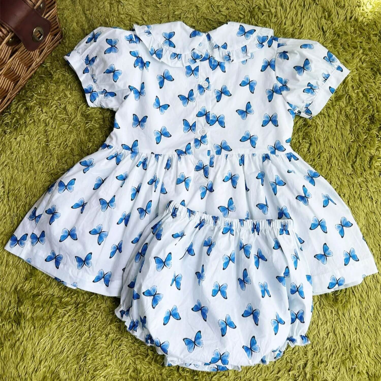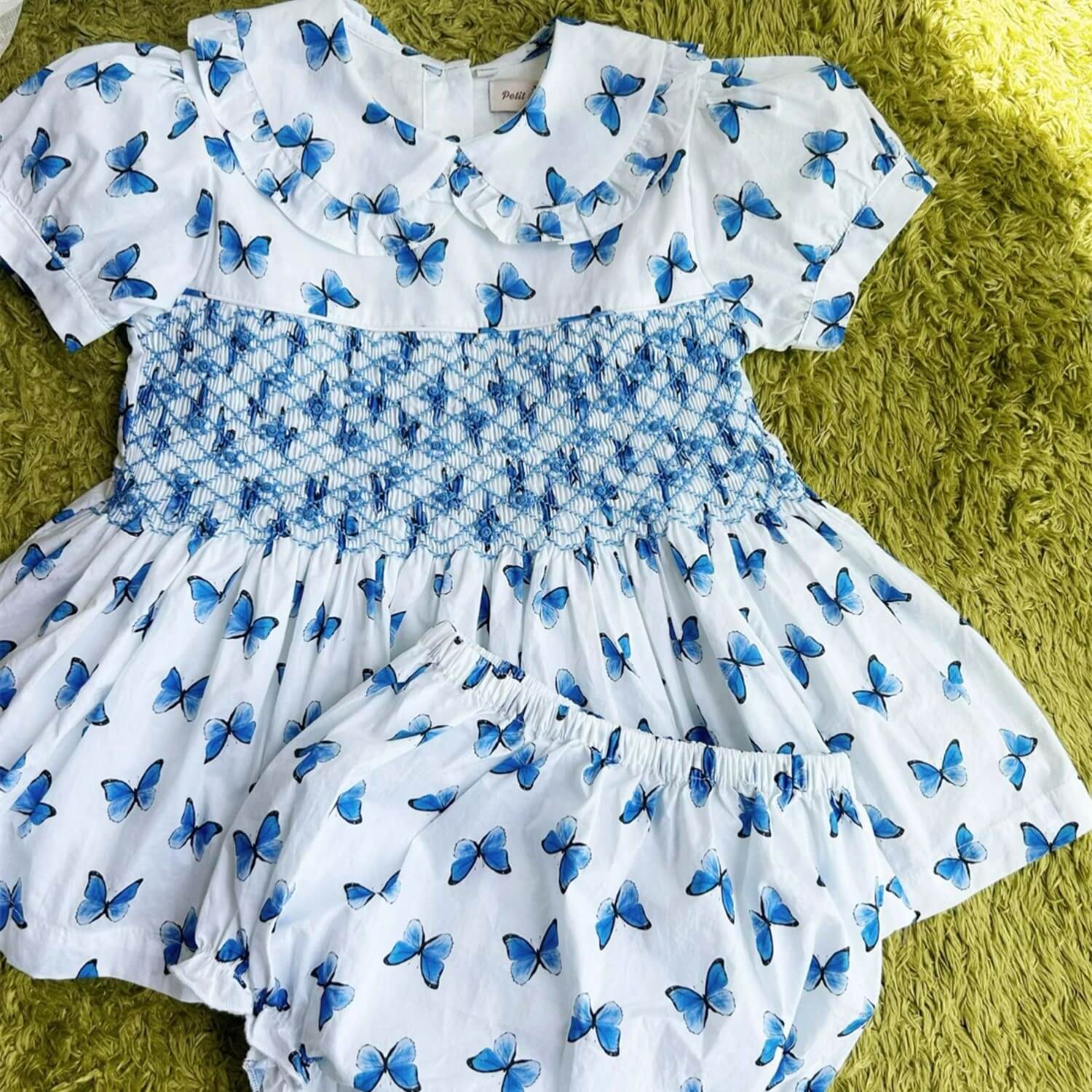 A beautiful dress with the cutest butterfly print. A beautiful butterfly print in cute print with stunning hand smocking and hand embroidery. Peter pan collar adds to the charm. A cute dress and comes with matching shorts/bloomers.