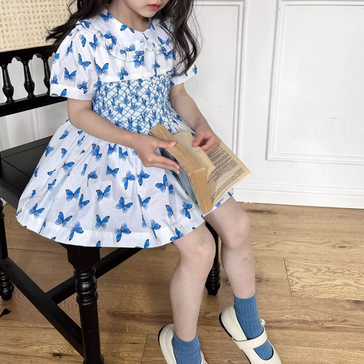 Butterfly Print Blue Hand Smocked Dress,2T to 7T.