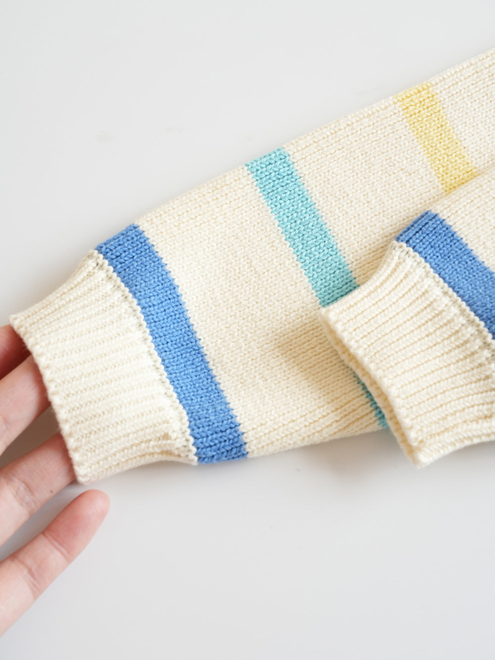 Designed with pastel rainbow stripes and adorable wooden-style buttons, this sweater adds a magical pop of color to any outfit. The classic collared neckline gives it a cute, polished look, while the snug ribbed cuffs keep your child warm through every adventure.